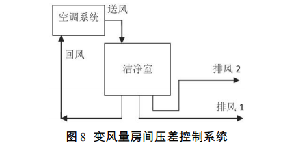 對于部分潔凈車間,由于其生產活動的變化,房間對外壓差可能有正負壓切換的需求,如正負壓切換手術室。對于需要正負壓切換控制的潔凈車間,通常通過調整潔凈車間的排風量來實現正負壓切換。房間維持正壓時,排風量較小,房間維持負壓時,排風量較大。具體的風量通過計算確定。變風量壓差控制系統見圖 8。通常根據計算結果選用兩臺排風機,正壓運行時只開啟一臺排風機,負壓運行時同時開啟兩臺排風機。