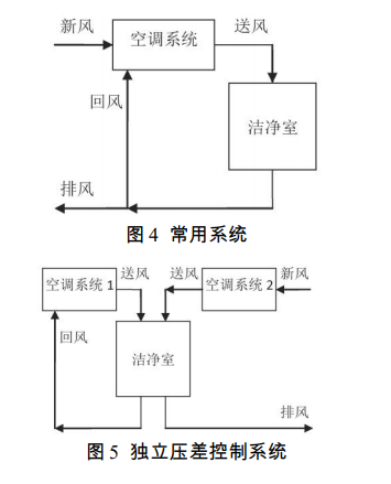 一般潔凈車間只設置一套空調系統,以實現溫濕度和壓差的控制。由于進行壓差控制需對系統內送、回、排風量進行調節,系統的穩定性因此下降。對于系統內壓差影響因素變化較多且壓差控制要求較高的潔凈車間,可采用兩套空調系統。其中一套空調系統恒定風量,對室內的溫濕度進行控制;另外一套系統主要用于控制潔凈車間的壓差。由于壓差控制由獨立的系統提供,調節方便且不會影響到房間的溫濕度控制。詳見圖 4~ 圖 5。