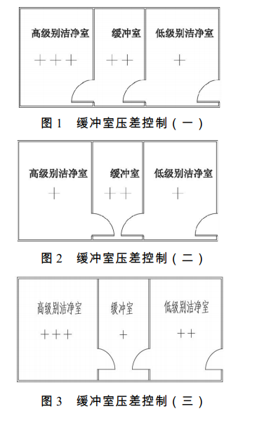 緩沖室的壓差設置通常有 3 種(見圖 1 ~ 圖3):其一是從高凈化級別房間到低凈化級別房間或非凈化區壓差依次降低,這可以有效防止低級別或無級別房間對高級別房間的影響;其二是緩沖室對兩邊的房間均為正壓,這樣可以有效防止兩邊房間的相互干擾;其三是緩沖室對兩邊的房間均為負壓,這樣也可以有效防止兩邊的相互干擾。正壓緩沖室通常被稱為“正壓井”,國外稱為“Bubble AL”。