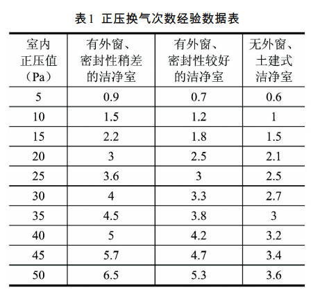 相對正壓潔凈車間的滲透風量,通常也成為正壓風量,是維持室內正壓所需的風量,即公式 1中 LA。對于相對負壓的潔凈車間,其滲透風量值為負,即空氣自周圍房間滲透進入負壓潔凈車間。滲透風量的設計計算通常有兩種,其一是換氣次數法,其二是縫隙法。換氣次數法,就是根據潔凈車間相對正壓的值確定正壓換氣次數,依次計算正壓滲透風量。對于房間正壓與換氣次數之間的關系,相關設計手冊 / 規范給出了推薦數值(見表 1)。